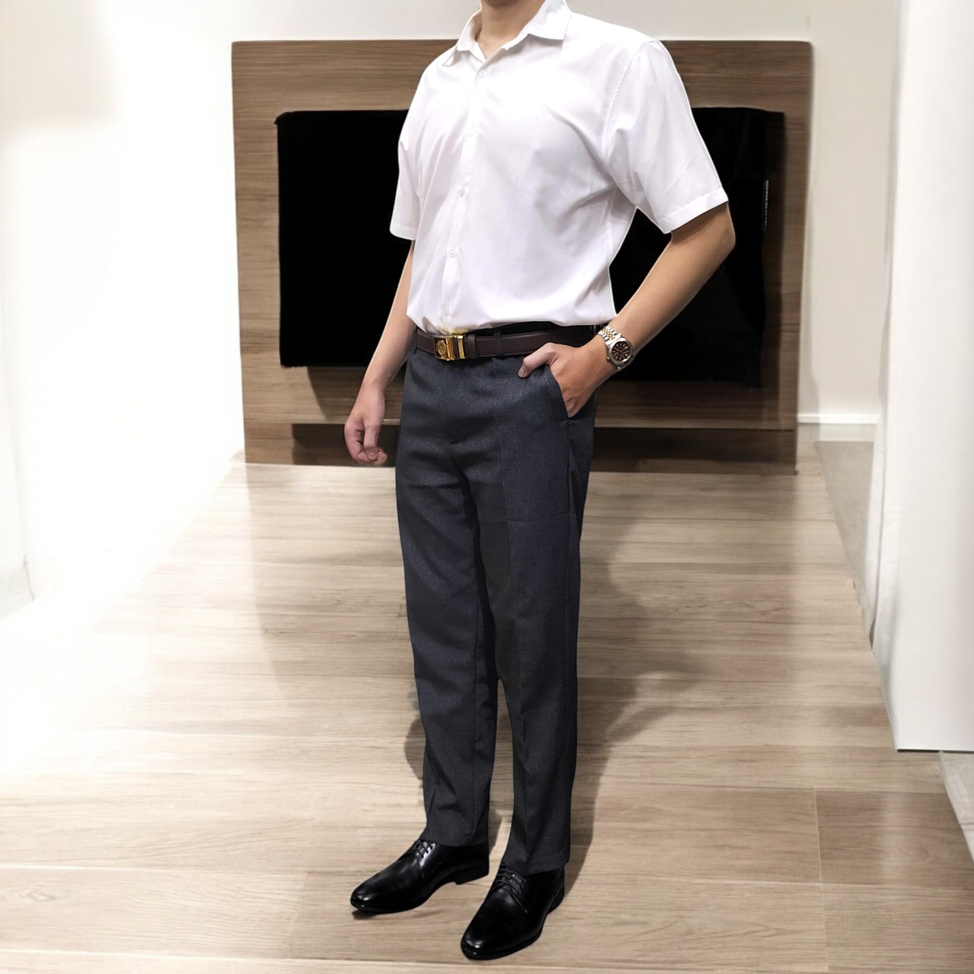 Áo sơ mi trắng + quần âu đen + giày tây oxford đen + thắt lưng da đen + cà vạt (tùy chọn).